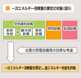 「住宅事業建築主の判断の基準」では、省エネルギー性能をより高めることを目的に、従来の断熱性能に加えて、建築設備の効率性について総合的に評価するため、「住宅で消費される一次エネルギー消費量」を指標とした基準を定めました。要するに、断熱性能の向上と省エネ設備の導入効果によって、家庭で消費されるエネルギー自体の削減を図ったものです。「建築主の判断基準」が、断熱性能を高めることで暖冷房に要するエネルギーの削減を間接的に図っていることに対し、「住宅事業建築主の判断の基準」は、エネルギーの削減を直接的に行おうとしています。