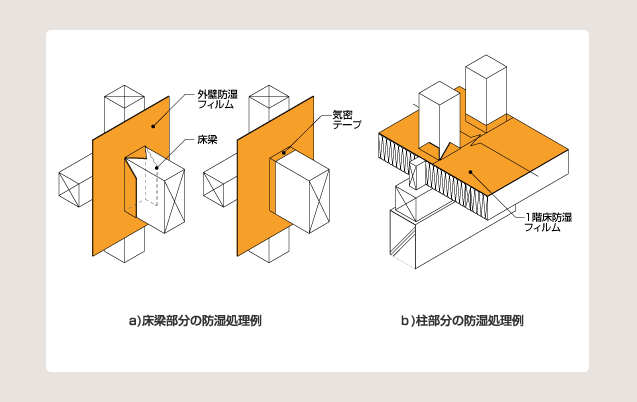 通常はa)のように、防水のため、枠の外気側でシールするのが一般的です。この方法で開口部の枠まわりの防湿はある程度保つことができます。しかし、この仕様では、室内側の水蒸気が枠と構造材の隙間まで侵入します。寒冷地などでは、枠と構造材の隙間における結露を防止するための措置として、枠の室内側で防湿性に優れた材料(気密テープなど)で防湿処理するb)のような方法があります。